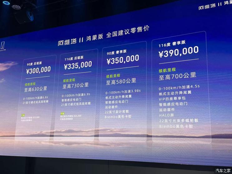 [本站 新车上市]8月24日,阿维塔11鸿蒙版正式上市,新车推出4个配置车型,售价30-39万元。12月31日前(含)下定即享5000元定金抵25000元购车款的超值限时优惠,首任车主可享终身三电质保。购车可以享受多种权益,同时针对老车主也推出了多项升级和购车福利,具体信息见下图。阿维塔11鸿蒙版主要产品特点是采用曜黑车色,运动套件,内饰品质优化,7项豪华配置升级,实用HUAWEI ADS 2.0鸿蒙座舱,全系NAPPA内饰,二排独立座椅,最高730公里续航,支持750V高压超充,新车还配备舒适刹停功能,通过底盘域控制器升级,新车的制动系统能够智能调节制动力。