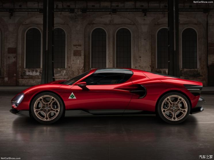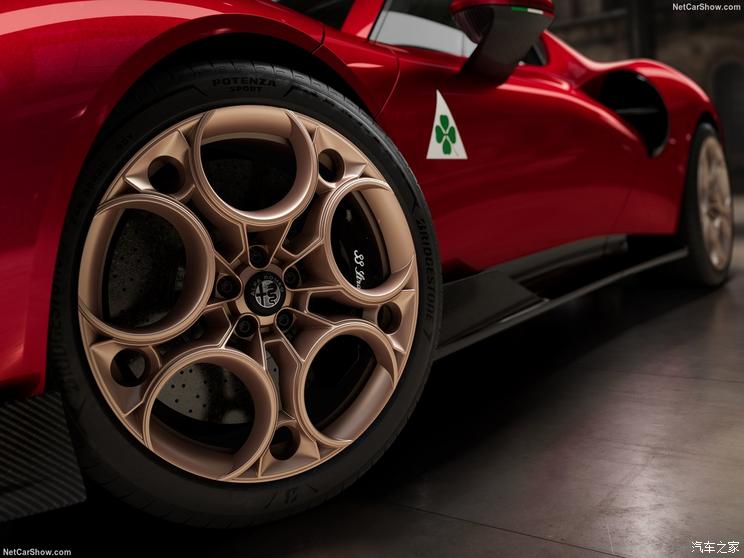 车侧部分,拥有相当强的流线性,同时,车侧细节处也采用了诸多彰显身份的设计。比如,新车配备了辨识度非常高的家族式轮圈,不过颜色由常规的银色换成了香槟金色。内部的运动卡钳上配有33 Stradale字样。此外,新车前翼子板后方将会集成四叶草徽标;后轮上方隆起的肌肉线条以及尺寸宽大的进气口也能够凸显出它不凡的实力。当然了,新车还将集成大量碳纤维车身套件,实现更加出色的轻量化表现。