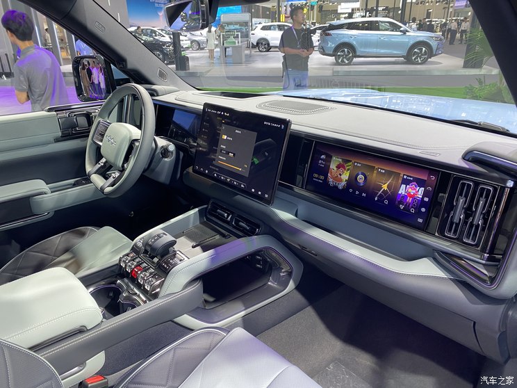 豹5内饰延续了硬派的风格,中控台部分共搭载了三块屏幕,中央是一块15.6英寸2.5K高清中控多媒体屏,主驾采用12.3英寸仪表屏,副驾位置搭载12.3英寸多媒体娱乐屏。豹5内饰设计整体基于“锁扣”这一理念,象征着链接和独特,意味着力量与安全,和外观进行呼应。中控台部分采用了可升降换挡挡杆,车辆启动时换挡升起,关闭时挡杆缓缓回落,满满仪式感。