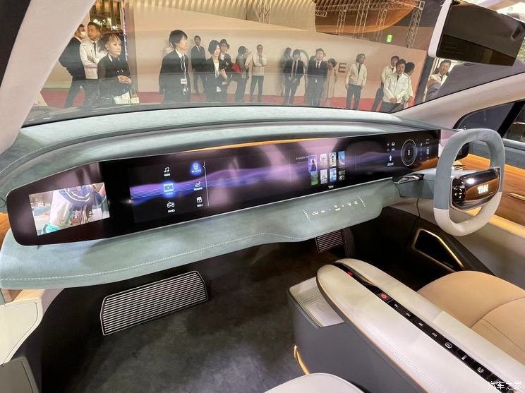 进入车内,木质饰板加上大量的皮质面料看上去非常温馨,同时还具备一定的高级感。整个中控台被大尺寸的屏幕所占据,内部集成娱乐信息、车辆信息和仪表盘,同时两侧还有电子后视镜的显示屏幕。此外,新车所配备的方向盘看上去也很有未来感,中控台和中央扶手处保留了触控式的电子按键。