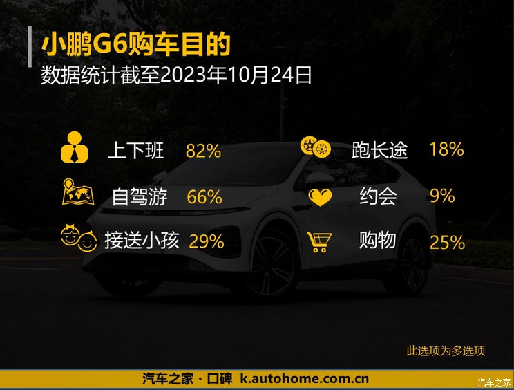 由调研结果来看,车主们购买小鹏G6的主要目的为上下班、自驾游、接送小孩、购物等,其中上下班占比最高,为82%,自驾游占比也达到66%。车主们选择小鹏G6,更多是用于日常代步和假期出游,毕竟它不仅有着相对宽敞、舒适、豪华且智能的座舱。相较于燃油车,小鹏G6作为纯电动车,其低廉的用车成本也是优势所在。