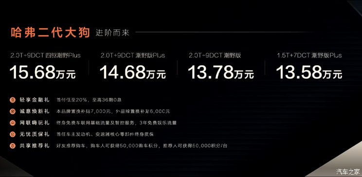 哈弗大狗最早于2020年9月份推出,此后它虽然取得过月销过万的成绩,但是市场表现一直很难稳定,目前该车共有3款车型在售,售价区间12.39-14.99万元。2023年3月哈弗二代大狗正式推出,包括燃油版和插混版共6款车型,售价区间为13.58-17.58万元。二代大狗晋升为中型SUV,车身尺寸、配置以及动力方面均得到了升级,在它推出之后,大狗系列车型月均销量连续6个月保持1万以上,预计很快便会突破1.5万的大关。