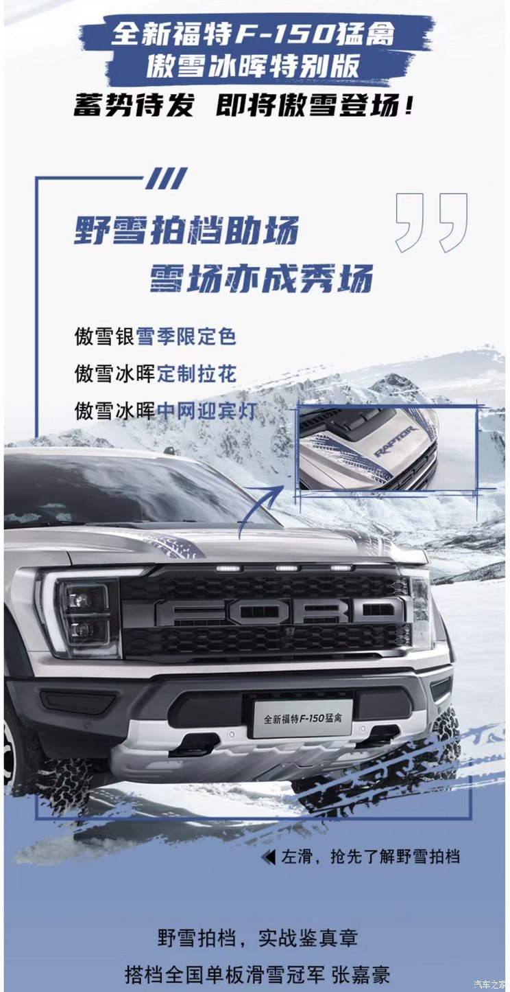 [本站 资讯]  日前,我们从官方获悉,福特F-150猛禽傲雪冰晖特别版车型将于11月17日正式开启订购,该车主要针对外观进行了冰雪主题的升级,并与全国单板滑雪冠军张嘉豪进行了联名。订车可享限定专属礼遇,包括中网迎宾灯、个性软壳以及远征白皮书。
