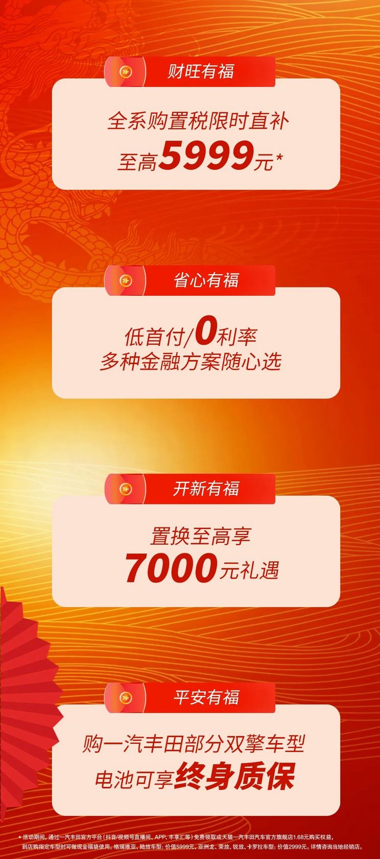 除了购置税直补之外,一汽丰田还带了多项福利,包括“低首付/0利率,多种金融方案随心选”、“置换至高享7000元礼遇”、“购一汽丰田部分双擎车型电池可享终身质保”等。