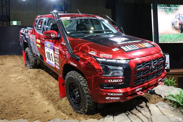 这辆红色涂装的L200也进行了越野化的改装,配备了升高的悬架、拖车钩、大直径的AT全地形轮胎等,涉水喉的造型比上一辆L200更加夸张。这辆车的车身上贴满了赞助商拉花,还有编号为101的号码牌,从整体风格来看应该是一辆拉力赛车。