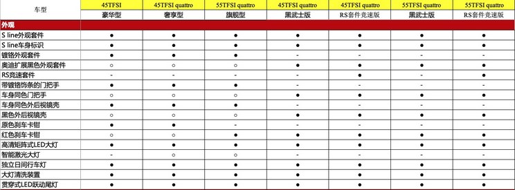 动力组合并没有变化45 TFSI搭载245马力的2.0T发动机,55 TFSI为340马力的3.0T V6发动机,2.0T提供两驱和quattro四驱,3.0T车型标配quattro四驱系统,另外高配车型标配的ACC全速域自适应巡航等功能在中低配版本上提供选装。