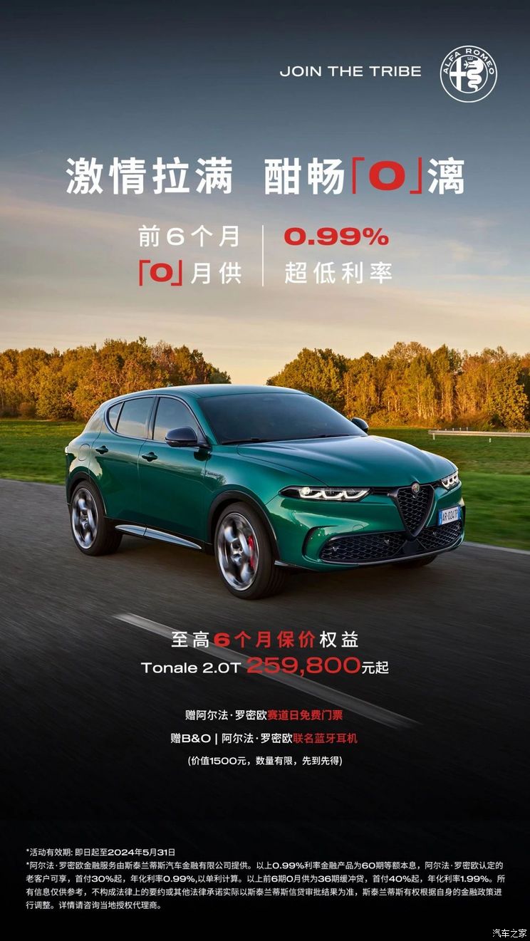 新款Stelvio斯坦维提供前6个月0月供+0.99%超低利率贷款权益,此外还有至高6个月保价权益。此外,购车还将赠送阿尔法・罗密欧赛道日免费门票和阿尔法・罗密欧B&O联名款蓝牙耳机。以上权益有效期为2024年3月15日至5月31日。