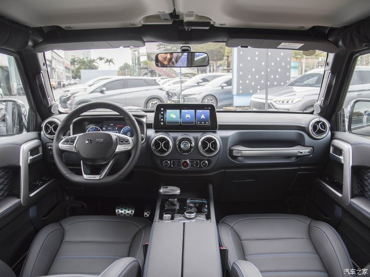 越野配置方面,电控四驱分动器、金属防滚杠、黑色可拆卸式硬顶棚、轻量化前桥为全系标配,可选装前桥电控差速锁、后桥电控差速锁。10.25英寸中控屏(720p)支持悦野圈功能,包含手机互联、远程控车、车况查询/故障诊断、越野组队、越野路书、越野教学/场地查询、道路救援、防盗报警、在线违章查询、越野轨迹记录及分享等。