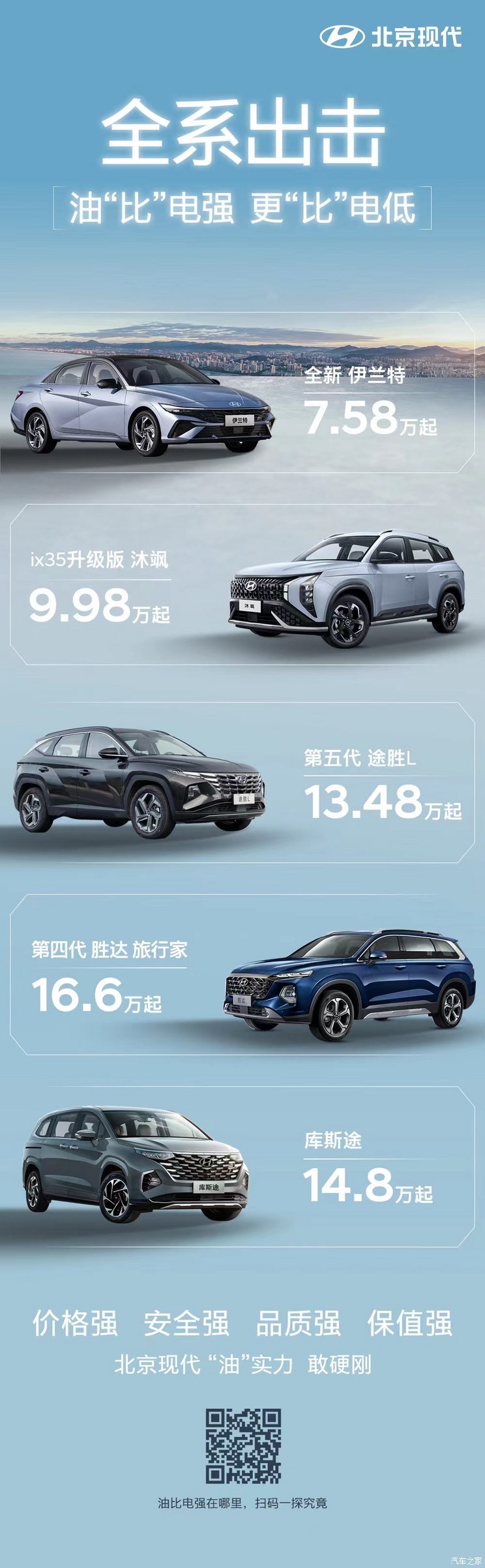 伊兰特目前共有7款在售车型,售价区间为9.98-12.98万元,新价格起售价降低了2.4万元。现代ix35沐飒共有10款在售车型,售价区间为12.18-16.78万元,新价格起售价降低了2.2万元。途胜L共有共有10款在售车型,售价区间为16.18-21.98万元,新价格起售价降低2.7万元。胜达旅行家共有6款车型在售,售价区间为20.28-26.98万元,新价格起售价降低3.68万元。库斯途共有6款在售车型,售价区间为16.98-21.88万元,新价格起售价降低了2.18万元。