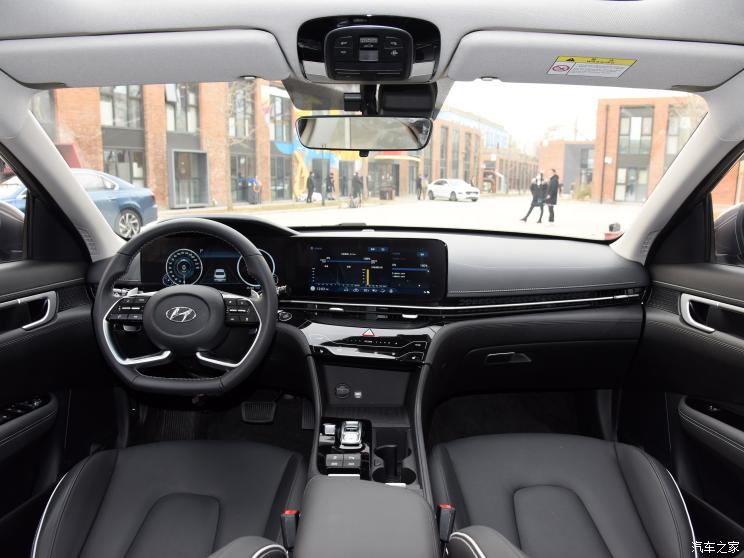 内饰的设计同样沿用了最新的家族化样式,和索纳塔车型相似度很高。整体偏向驾驶员一侧的设计,而贯穿整个中控台的空调出风口也是它相比索纳塔的内饰区别最明显的地方,贯穿式的设计也很好的延展了车内的横向视觉空间。双12.3英寸的仪表盘和中控大屏已经被越来越多的车型使用,科技感十足,并且提供手机互联、语音控制、高精地图等功能,并支持手势控制。
