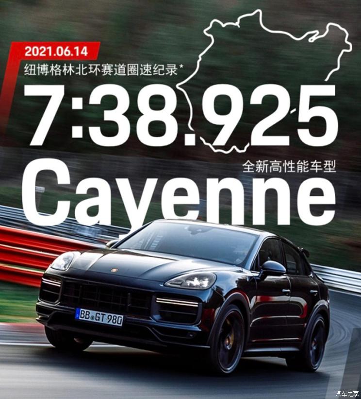 [本站 资讯] 近日,保时捷官方宣布,旗下一台即将上市的Cayenne Coupe高性能版车型,以7:38.925的圈速刷新了纽博格林北环量产“SUV、越野车型、厢式货车、小型货车”组别的圈速纪录,一举击败了此前奥迪RS Q8创下的7:42.253的圈速记录。虽然这款高性能版本还未上市,但被认定为量产版本,并配备赛车座椅和车内防滚架。