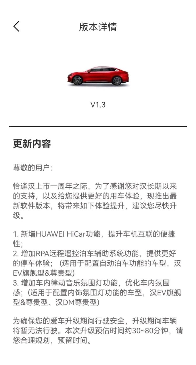 为确保您的爱车升级期间行驶安全,升级期间车辆将暂无法行驶。本次升级预估时间约30~80分钟,请您合理规划,预留时间。