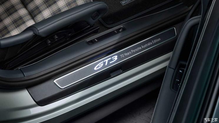 内饰中,新车门槛部分,同样标有“70周年 保时捷澳大利亚版”字样,并且采用了石墨蓝色的运动型座椅,座椅由皮质材料和Madraskaro织物拼接而成。此外,新车还在中央扶手上印有“70”的字样,进一步体现特别版车型的身份。