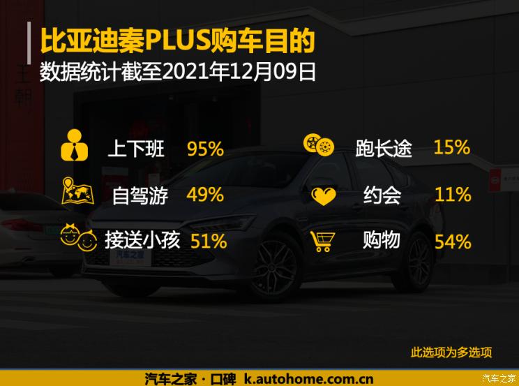 通过数据分析我们可以看到,购买比亚迪秦PLUS的车主朋友们主要的购车用途为上下班、自驾游和购物,与大部分家用车的用途保持一致。由此可见,家用依然是比亚迪秦PLUS最为核心的使用场景。因此,很多车主更加关心油耗、空间以及性价比。