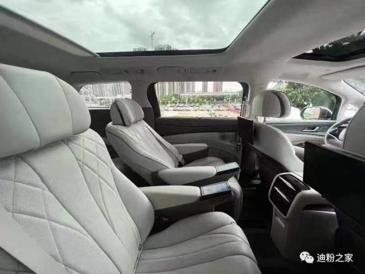 第二排两个独立的座椅,每个座椅在扶手区都有独立控制显示屏。同时,前排座椅后方,还有独立的娱乐系统显示屏。第二排还拥有一个巨大的天幕,与前排天窗分段式设计。