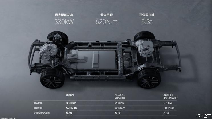 动力参数方面,理想L9的前驱动电机最大功率为130kW,后驱动电机最大功率为200kW。总功率达到330kW,峰值扭矩达到620N・m,0-100km/h加速时间仅为5.3s。