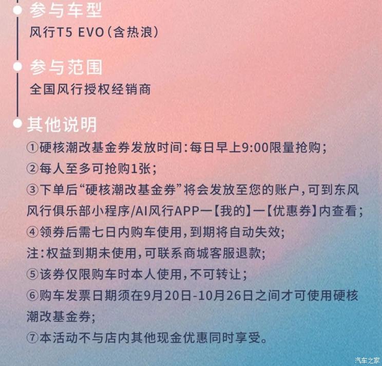 [本站 资讯] 9月22日,东风风行正式发售风行T5 EVO硬核灰改装卷,9月22日-10月20日期间,用户可登录东风风行俱乐部小程序参与。该活动具体内容为9.9元购券,抢券成功后在购车时出示,可享受购置税全免+2000元硬核潮改基金福利,参与的车型为风行T5 EVO(含热浪)。潮改基金券仅限量900份,每人至多可抢购1张,并且需要在领券后七日内购车使用,到期将自动失效。