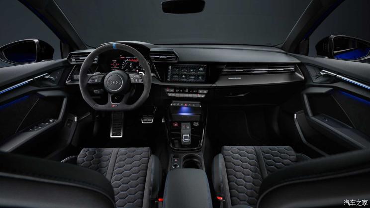 既然是高性能版,那就先从动力系统介绍。新车依旧搭载奥迪经典的2.5T涡轮增压直列五缸发动机,经过对涡轮增压器的重新校准以及对排气系统的优化,使其新车的最大功率提升至411马力(302千瓦),最大扭矩为500牛・米;传动系统上,新车依旧匹配7速双离合变速箱以及quattro四轮驱动系统,0-100km/h加速时间仅为3.8秒,选装RS Plus Dynamic Package套件后,最高时速可达300km/h。奥迪称,RS 3 performance将是同类产品中最快的车型。