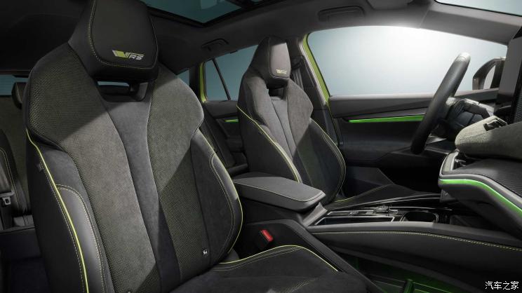 车尾部分,新车配备了一个黑色的车顶扰流板,尾灯组采用了熏黑式设计,后备厢上内凹式的牌照框区域配合层次感分明的后包围设计,让整车看上去更具有张力。另外,新车的Hyper Green绿色车漆则是vRS型号独有的,同时,ENYAQ iV vRS还可以选择一个全景天窗。车身尺寸方面,新车长宽高分别为4653/1879/1605mm,轴距为2768mm。