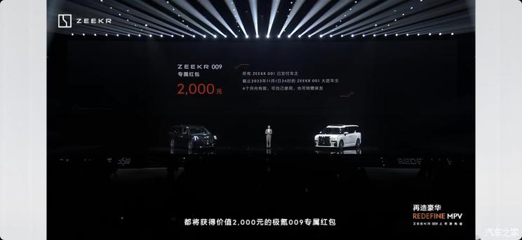 11月30日前(含当日)支付定金10000元,即进入排产序列,将限时免费获得价值35000元ZAD完全智能驾驶辅助包,免费升级价值8000元的高亮银镀铬格栅。而对于其他极氪用户,官方将提供2亿+元红包,所有ZEEKR 001车主(包括已交付和未交付的车主),以及截止到今晚12点前的001大定车主,都将获得价值2000元的ZEEKR 009专属红包,可自己使用也可转赠亲友,6个月内有效。